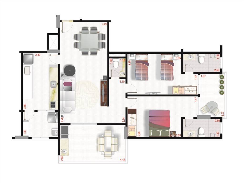 Características:- 3 Suítes- :Sala para 3 ambientes- Sacada goumet- Lavabo- Cozinha ampla- Área de Serviço- WC de serviço- Área Técnica- 3 vagas de garagem privativa