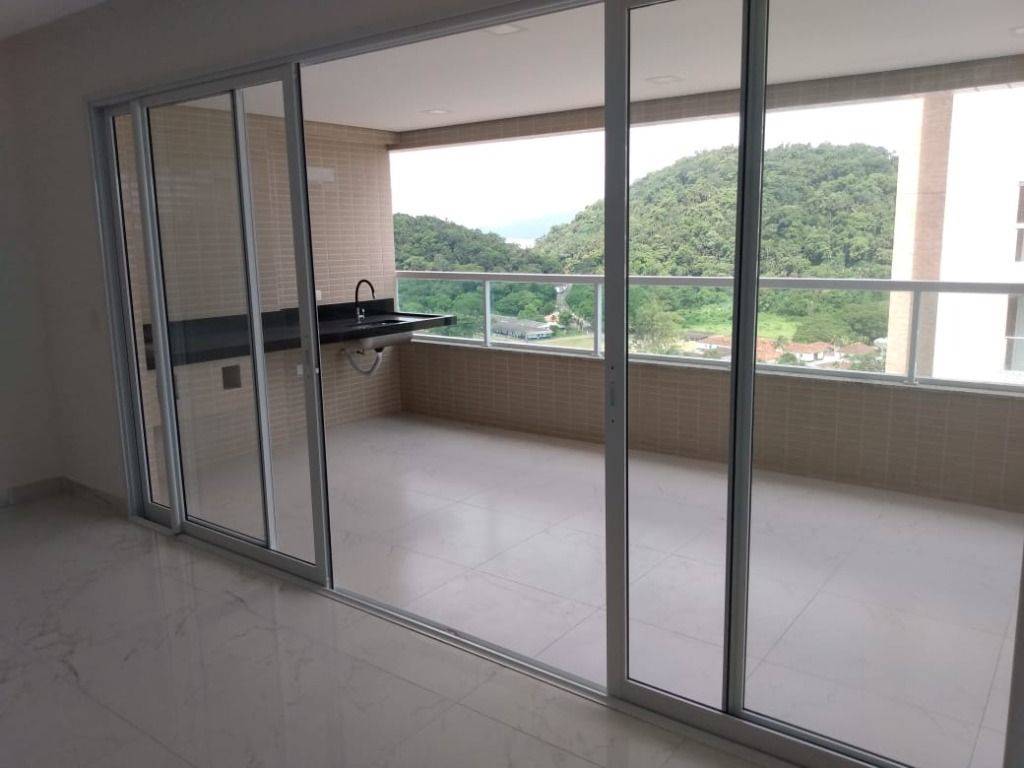 Apartamento em Praia Grande Canto do Forte, 3 Dormitórios sendo três suítes, Sala para dois ambientes com varanda Gourmet integrada, pequena vista mar, Cozinha, Banheiro, área de Serviço, Banheiro social, infraestrutura para Ar condicionado, aquecimento a