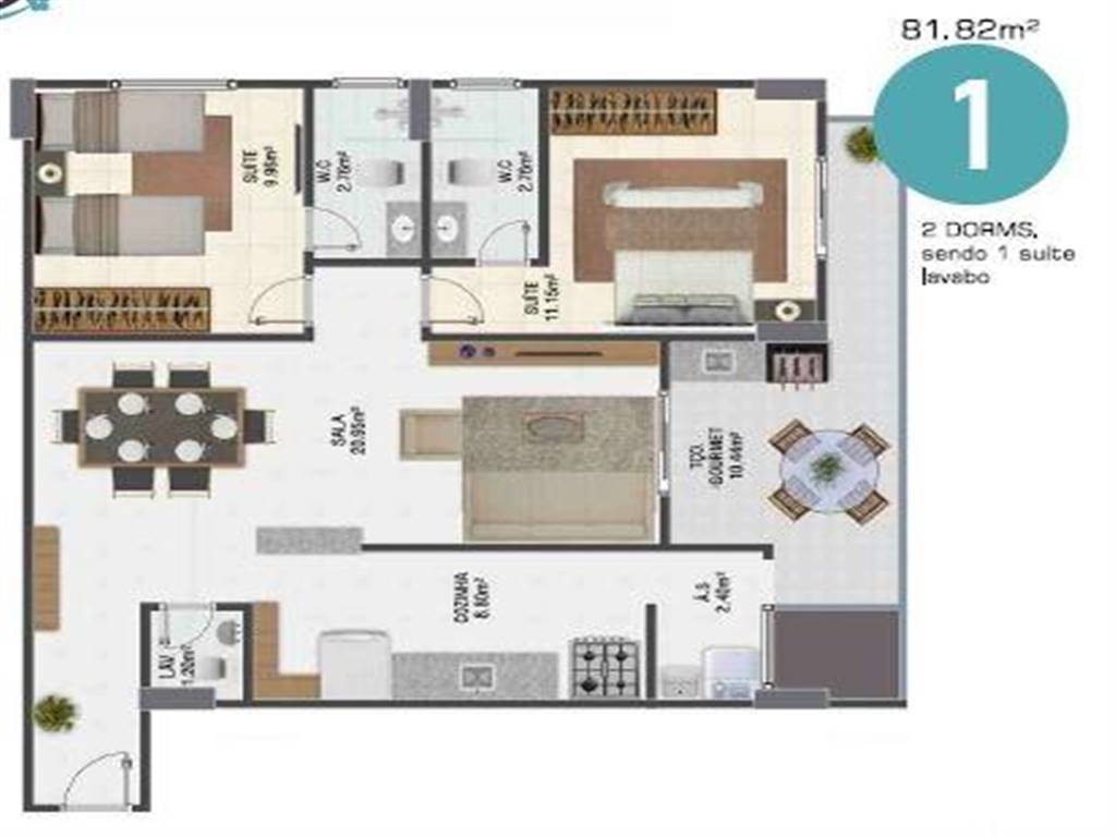 AP4273 - Apartamento com área útil de 81,82 m2 com 02 dormitórios sendo 02 suítes, lavabo, sala, cozinha, terraço gourmet com churrasqueira, área de serviço e 02 vagas de garagem. O bairro conta com supermercado, farmácia, sorveteria, padaria, e escola